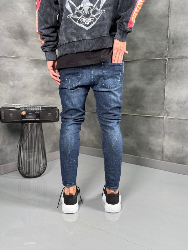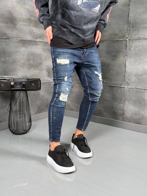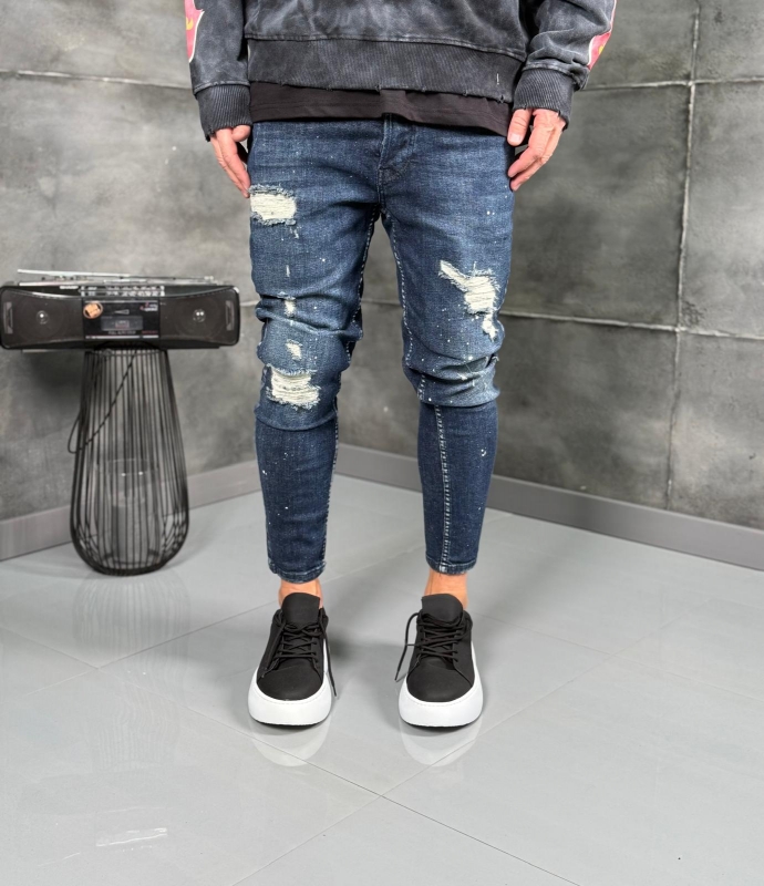 Мъжки дънки в тъмносин нюанс с агресивни накъсвания и избелен ефект, създаващи отчетлива street визия.