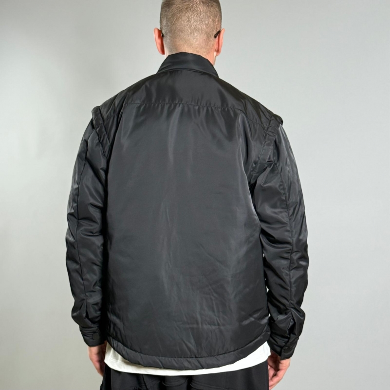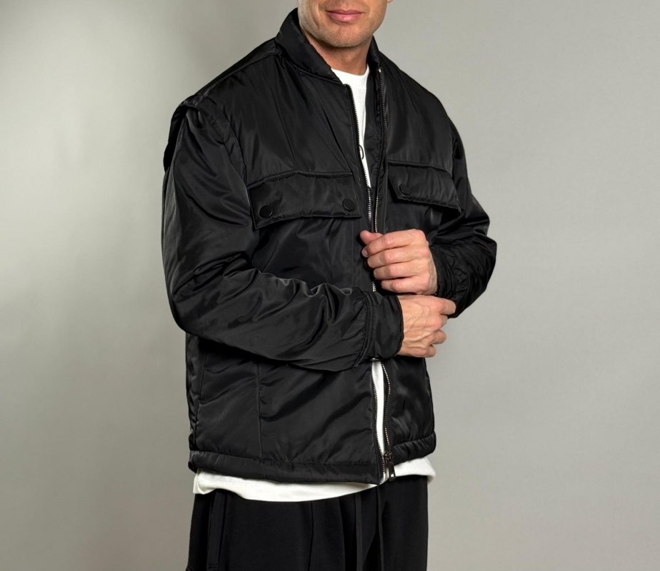 Мъжко късо яке в черен сатениран финиш, вдъхновено от класическия милитъри стил с модерен минималистичен прочит.